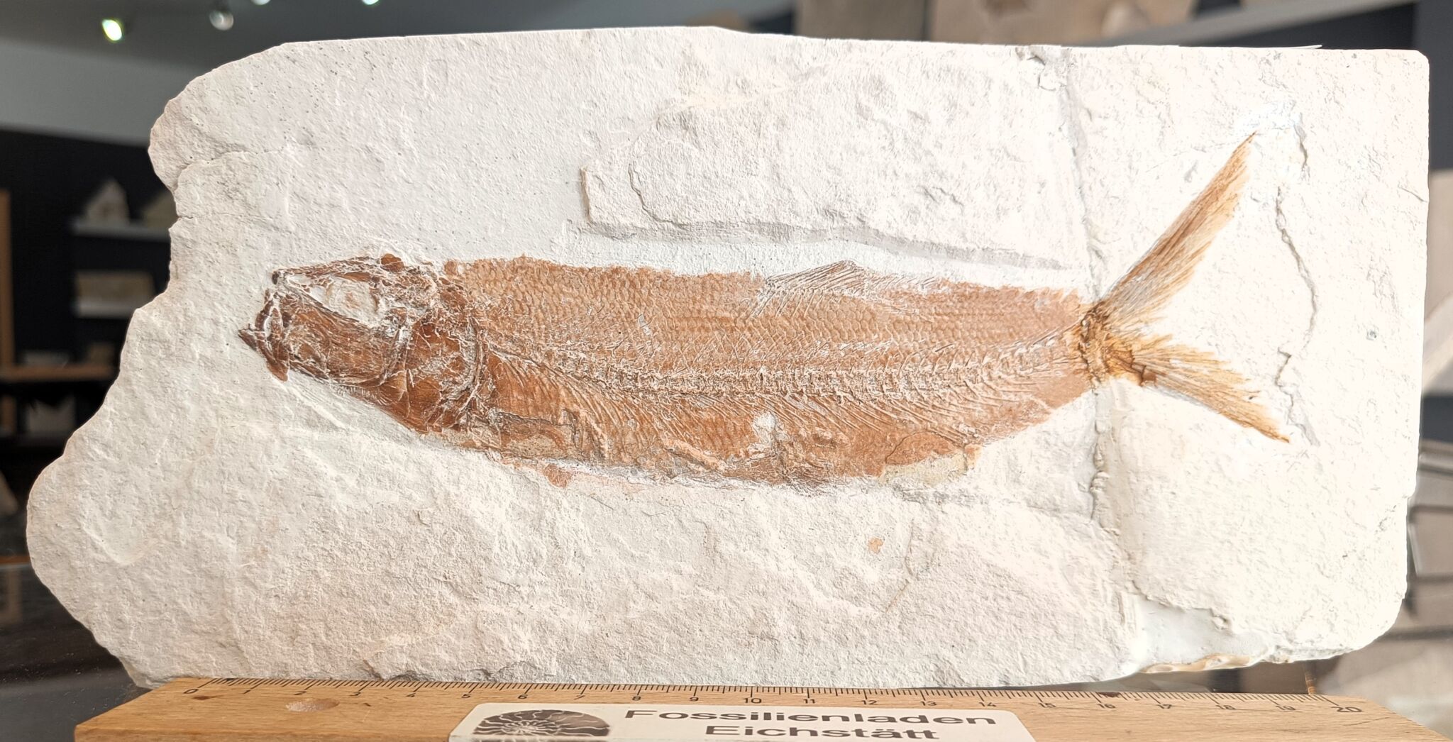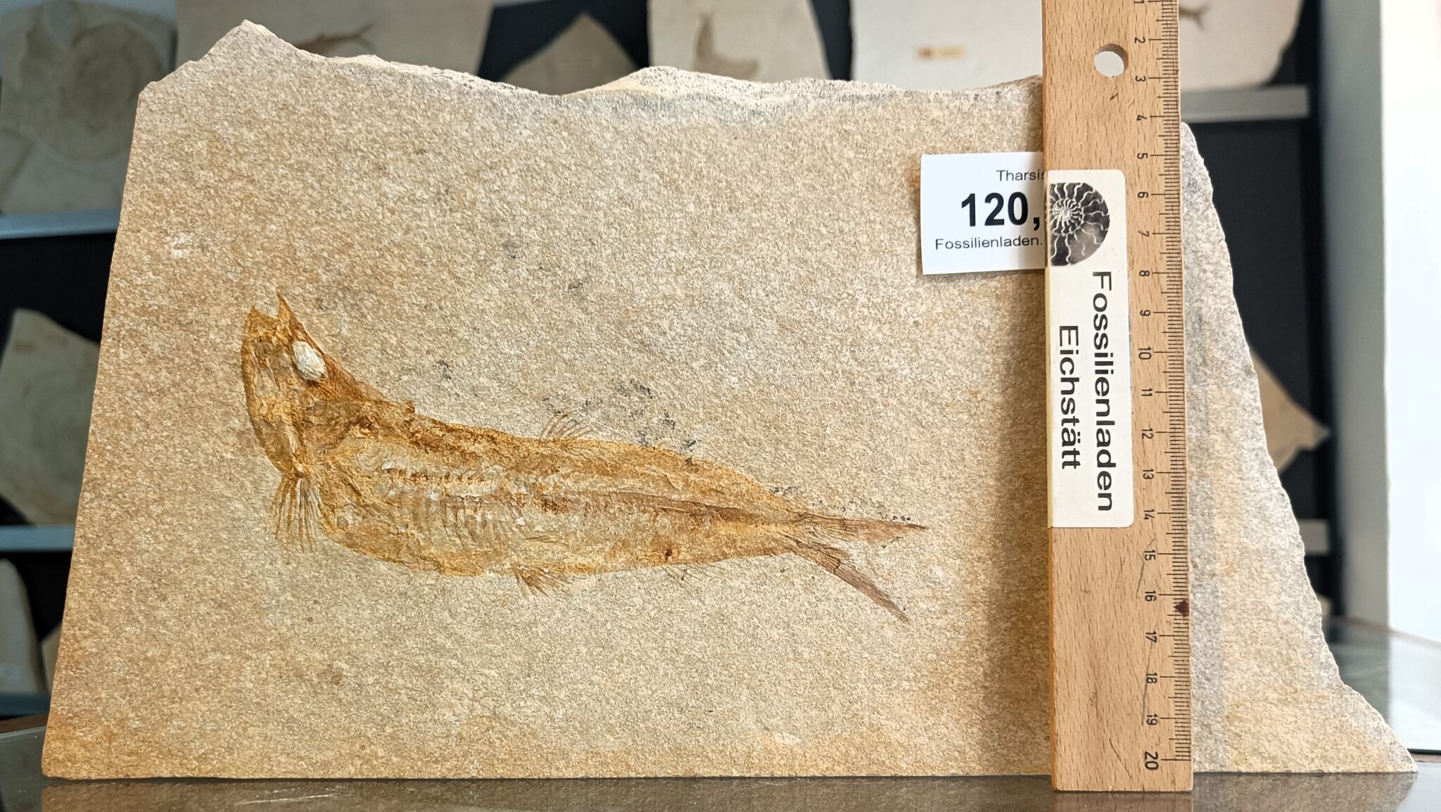 Fundort: Mühlheim, Landkreis Eichstätt, Jura, Malm zeta 3 – 4, Alter ca. 144 Mio. Jahre, Durchmesser Fisch max. ca. 19 cm, Gewicht 4785 g.