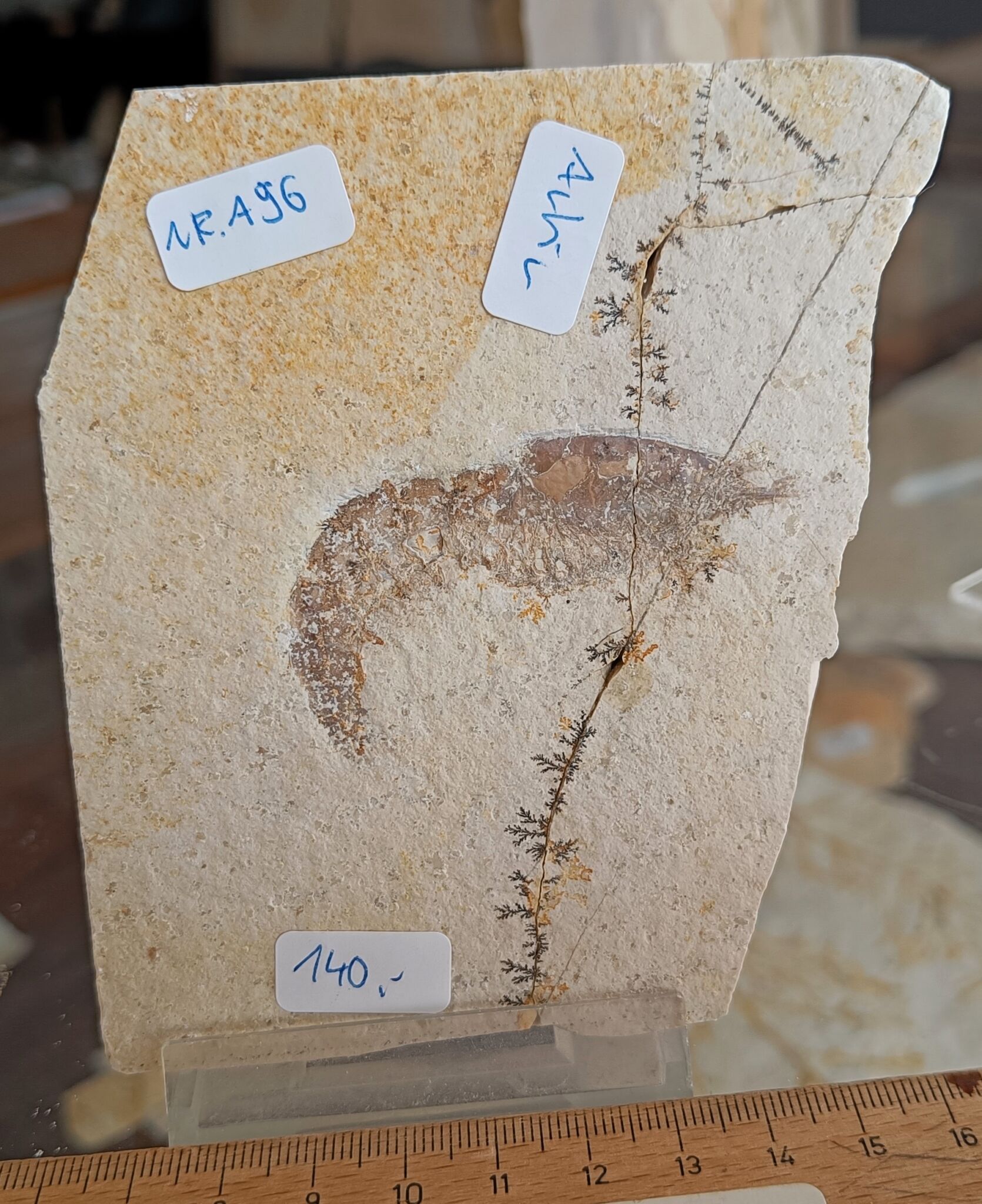 Fundort: Solnhofen, Jura, Malm zeta, Alter: ca. 150 Millionen Jahre, Länge Fossil max. ca. 10 cm, Geschnittene Kanten, ca. 23,4 x 13,7 cm cm, Gewicht ca. 1,275 kg. Plattenstärke ca. 1,5 cm. Versicherter Versand innerhalb D: 7,90 Euro