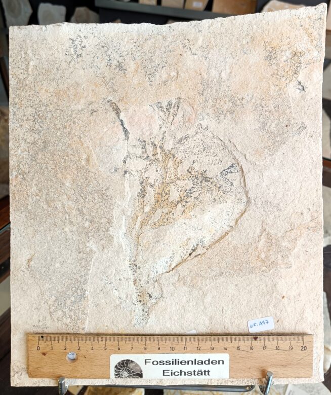 Beautiful jurassic plant! Location: Solnhofen, stratigraphic classification: upper Jurassic. lower Thiton, malm zeta , slab approx. max. 35.5 x 43 cm, weight approx. 14.1 kg., age approx. 150 million years, slab thickness 4 cm, plant 30 cm. Rare! 535 €