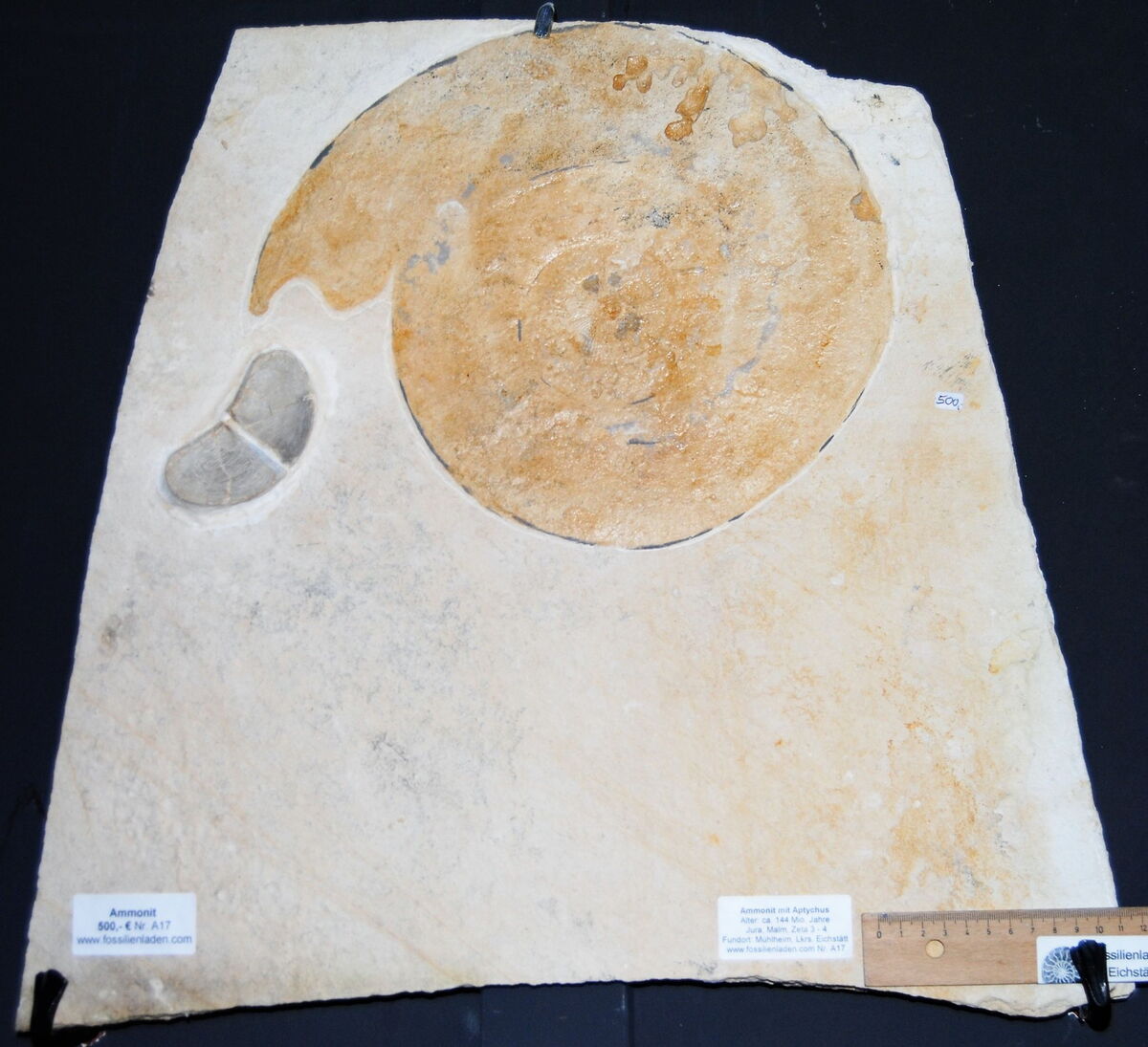 Alter: ca. 144 Mio. Jahre, Ob. Jura, Malm, Tithon Zeta 3, Altmühlformation, Fundort: Mühlheim, Lkrs. Eichstätt. Plattenstärke ca. 2,5 cm, Ammonit max. Durchmesser ca. 32 cm.