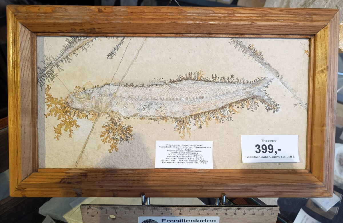 Sehr schöner Trissops sp.in altem Holzrahmen Fundort: Blumenberg Eichstätt, Obb. Unter-Tithonium, Weißjura-Gruppe, Altmühltal-Formation, Obere Eichstätt-Subformation Malm Zeta 2b Biostratigraphie: Hybonotum-Zone Riedense-Subzone, eigeltingense-beta-Horizont Alter ca. 150 Millionen Jahre. Holzrahmen ca. 36 x 21 cm Gewicht total ca. 2620 g, Fisch ca. 23 cm.