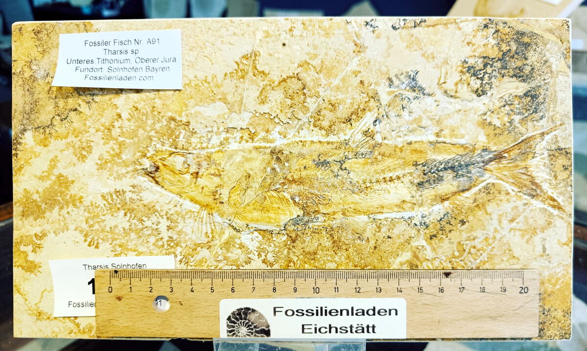 Schöner, günstiger Tharsis sp. Fundort: Solnhofen, Jura, Malm zeta, Alter: ca. 150 Millionen Jahre. Plattenstärke ca. 28 x 16 x 2,15 cm. Gewicht ca. 2,565 kg. Fisch ca. 20 cm. Eingearbeitete Aufhängeöse