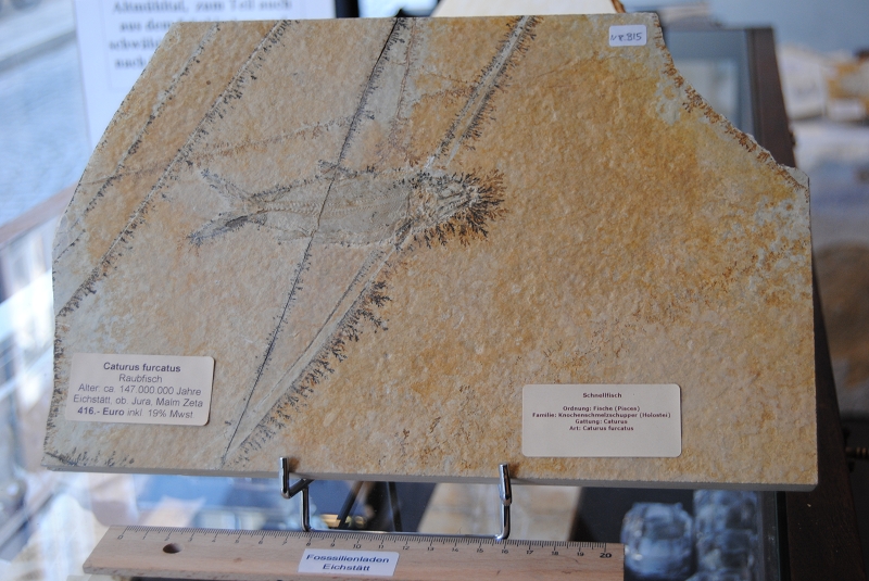 Schnellfisch Caturus furcatus, Alter ca. 147 Mio Jahre, Fundort: Eichstätt, ob. Jura, Malm Zeta, Plattenhöhe ca. 20 cm, Länge Fisch selbst ca. 12 cm