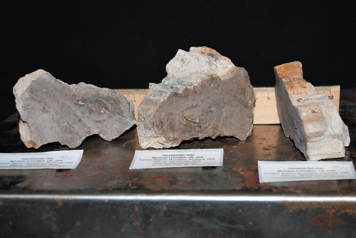 Fundort: Bighorns, Wyoming, USA, Morrison Formation, Oberjura, Alter ca. 150.000.000 Jahre. Durchmesser je ca. 9 cm, Gewicht (von links nach rechts): Nr. B73 ca. 205 Gramm, B74 ca. 270 Gramm und B75 ca. 225 Gramm.