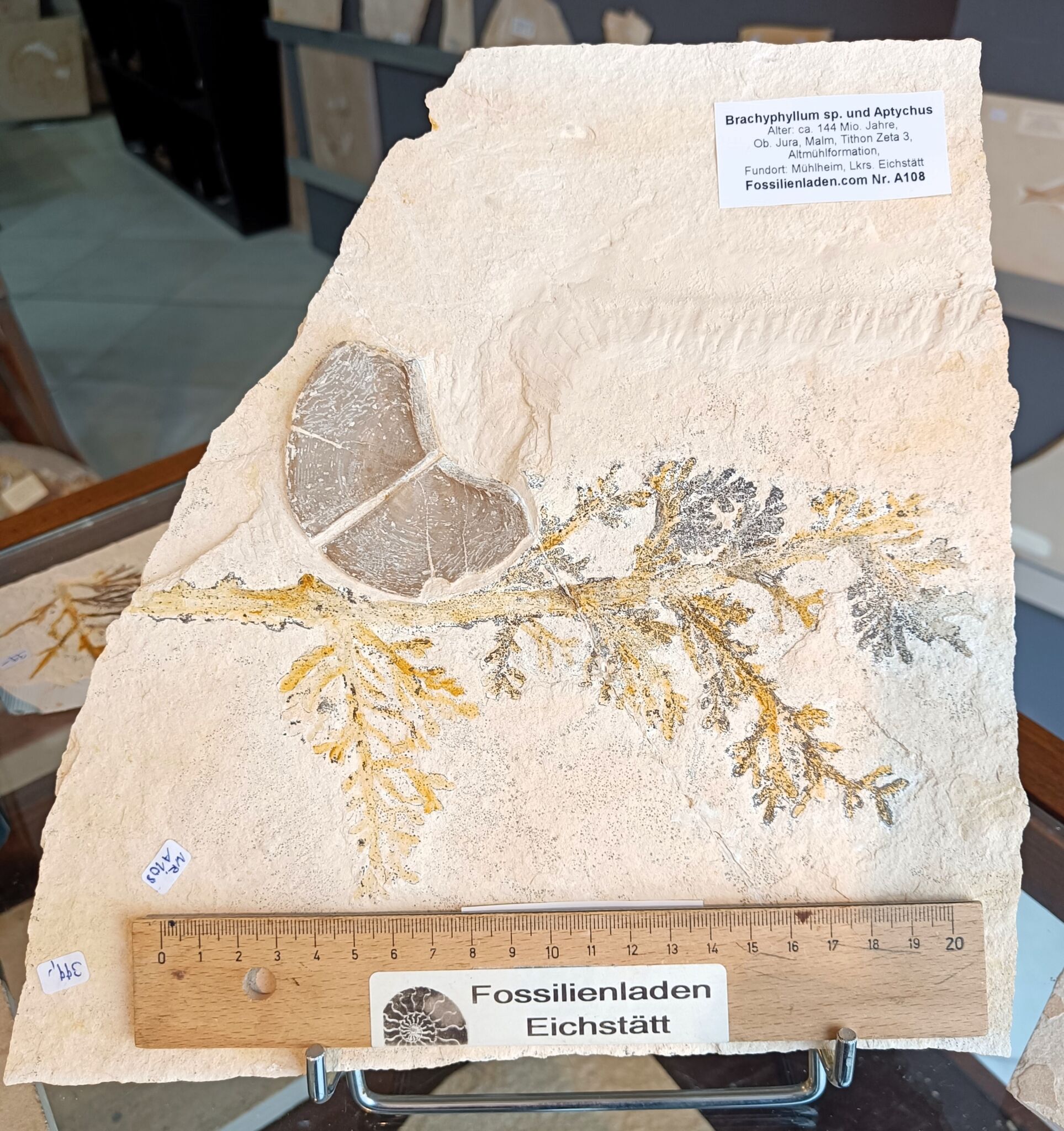 Fundort: Mühlheim, Mörnsheimer Schichten, Stratigrapie: Oberjura, Tithonium, Solnhofen-Formation, Malm zeta 3, Gewicht ca. 1105 g, Stärke ab 4 mm bis max. 1 cm, Fossiles Nadelholz ca. 22 cm.