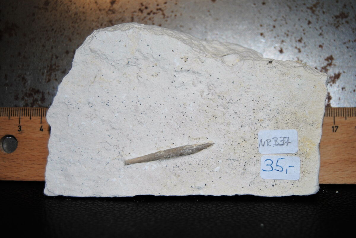 Fundort: Mühlheim, Landkreis Eichstätt, Oberer Jura, Malm zeta 3 – 4, Alter ca. 144 Mio. Jahre, Fossil ca. 3,7 cm, Plattenmaße ca. max. 11 x 6,5 x 2 cm, Gewicht ca. 250 gr.