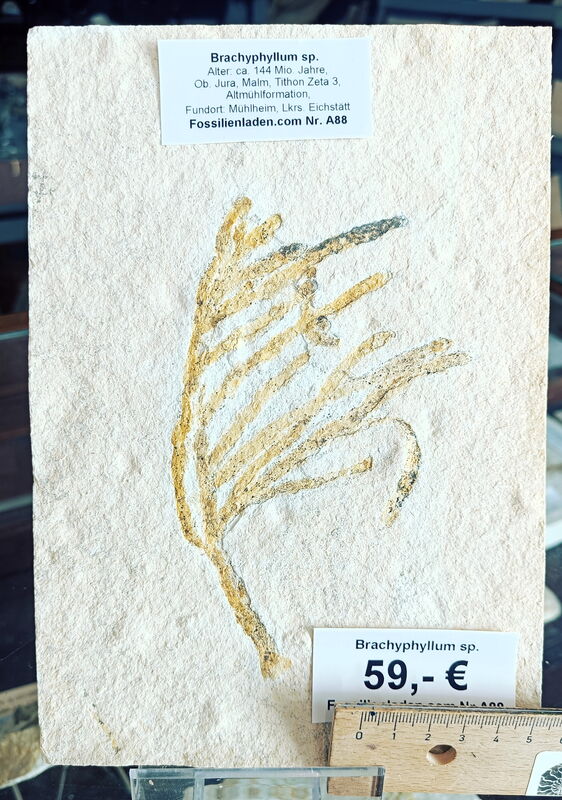 Fundort: Mühlheim, Mörnsheimer Schichten, Stratigrapie: Oberjura, Tithonium, Solnhofen-Formation, Malm zeta 3. Platte ca. 15,5 x 22,4 cm, Pflanze ca. 14,5 cm. Gewicht ca. 605 g, Stärke 9,1 mm , Fossiles Nadelholz. Sehr schön!