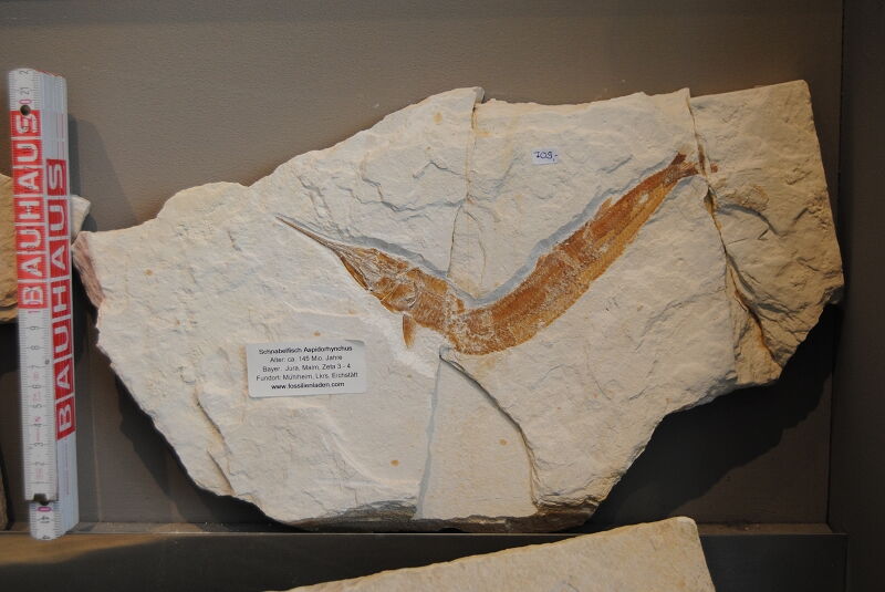 Belonostomus sp., kleiner aber feiner Schnabler aus Mühlheim, Landkreis Eichstätt, Malm Zeta 3 - 4, Alter ca. 144 Mio Jahre.