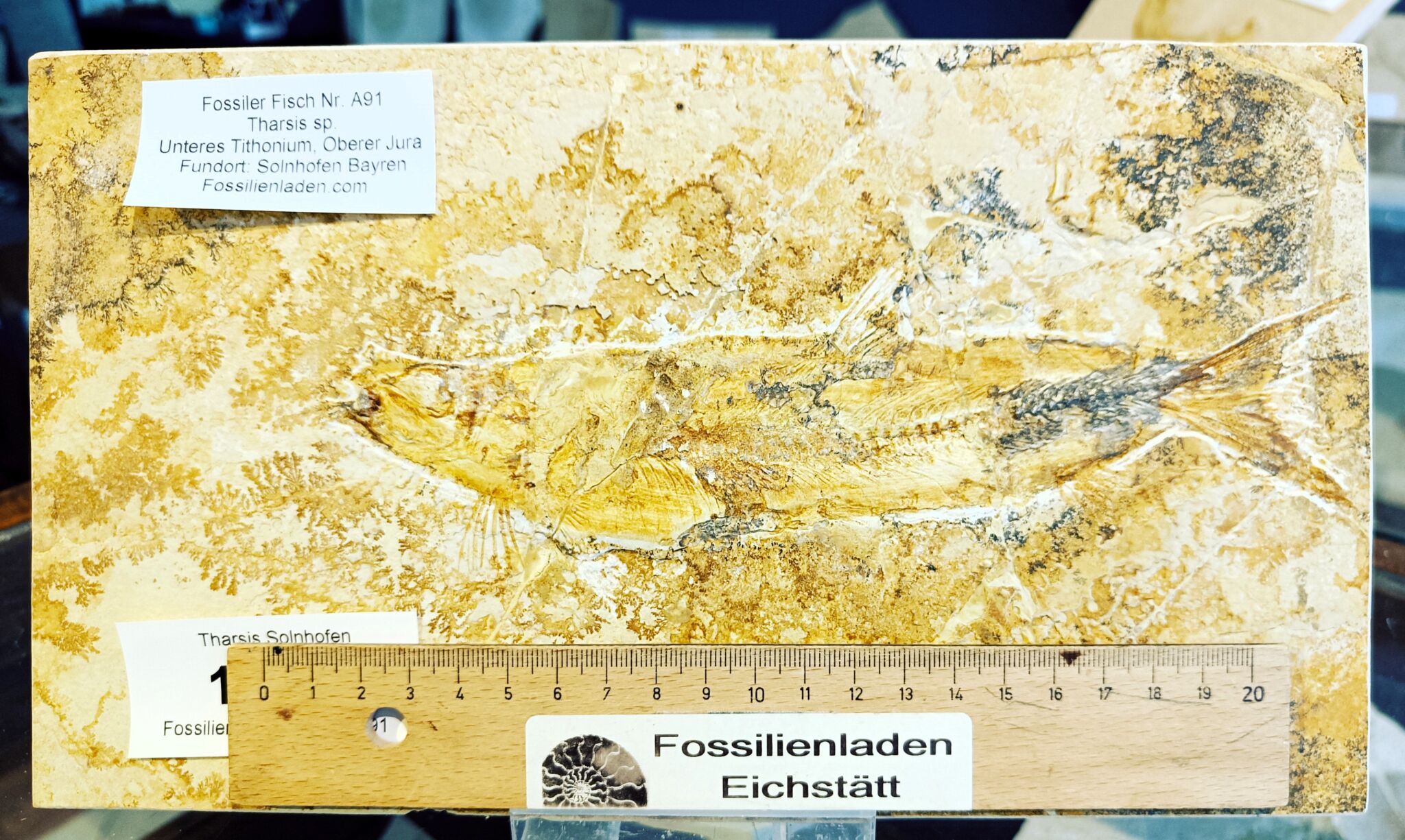 Schöner, günstiger Tharsis sp. Fundort: Solnhofen, Jura, Malm zeta, Alter: ca. 150 Millionen Jahre. Plattenstärke ca. 28 x 16 x 2,15 cm. Gewicht ca. 2,565 kg. Fisch ca. 20 cm. Eingearbeitete Aufhängeöse