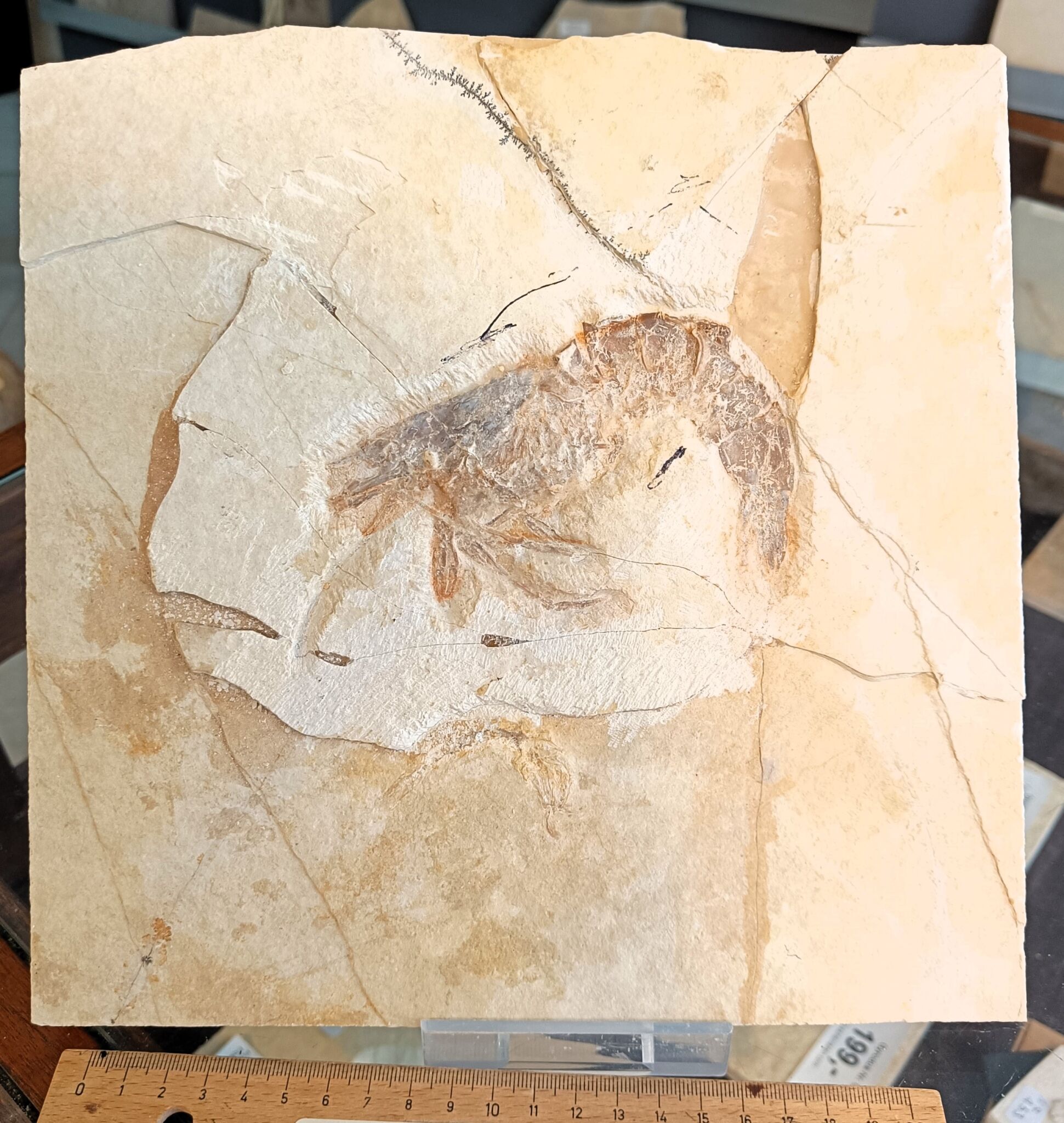 Günstiger Antrimpos! Fundort: Solnhofen, Jura, Malm zeta , Alter ca. 147 Mio. Jahre. Gewicht ca. 2450 gr. Plattenstärke ca. 1,8 cm, Platte ca. 24 x 24,5 cm Durchmesser Krebs max. ca. 13 cm, 2 Teile zusammengeklebt