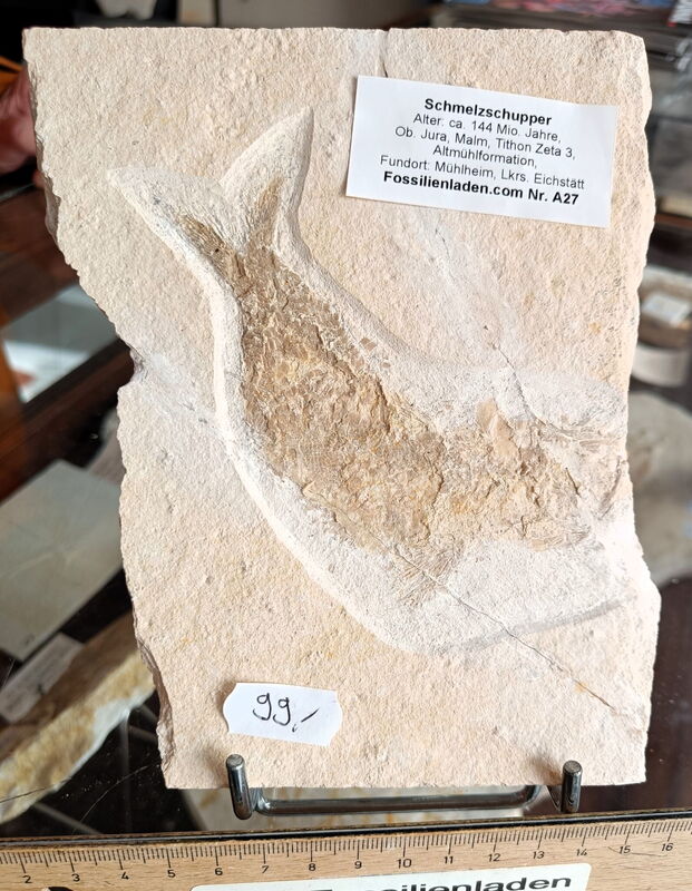 Fundort: Mühlheim, Mörnsheimer Schichten, Stratigrapie: Oberjura, Tithonium, Solnhofen-Formation, Malm zeta 3, Gewicht ca 475 g, Durchmesser Fossil max. ca. 12,5 cm Plattenstärke max. ca. 1,2 cm. Geschnittene Plattenunterkante ca. 10,5 cm