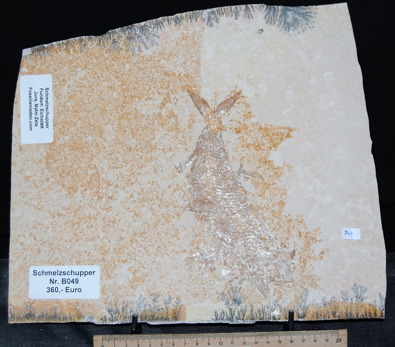 Fundort: Eichstätt, Jura, Malm zeta , Alter ca. 150 Mio. Jahre. Länge Fisch ca. 19 cm, Plattenstärke 1cm, Gewicht ca. 2,1 kg
