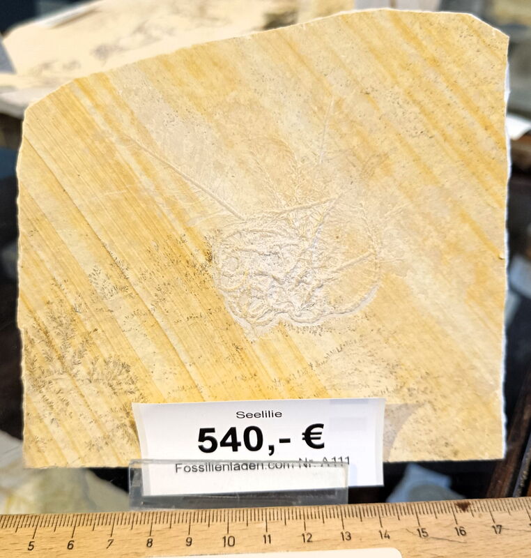 Antedon formosus Fundort: Zandt, Lkrs. Eichstätt Eichstätt, Obb. Lithostratigraphie: Tithonium, Weißjura-Gruppe, Painten-Formation, Zandt-Subformation. Quentstedt (nicht mehr gültig): Malm Zeta 1/2. Biostratigraphie: Hybonotum-Zone, Riedense-Subzone, eigeltingense-Horizont Alter ca. 150 Millionen Jahre. Sehr schön! Plattenstärke ca. 0,9 cm, Gewicht total ca. 355 g,.