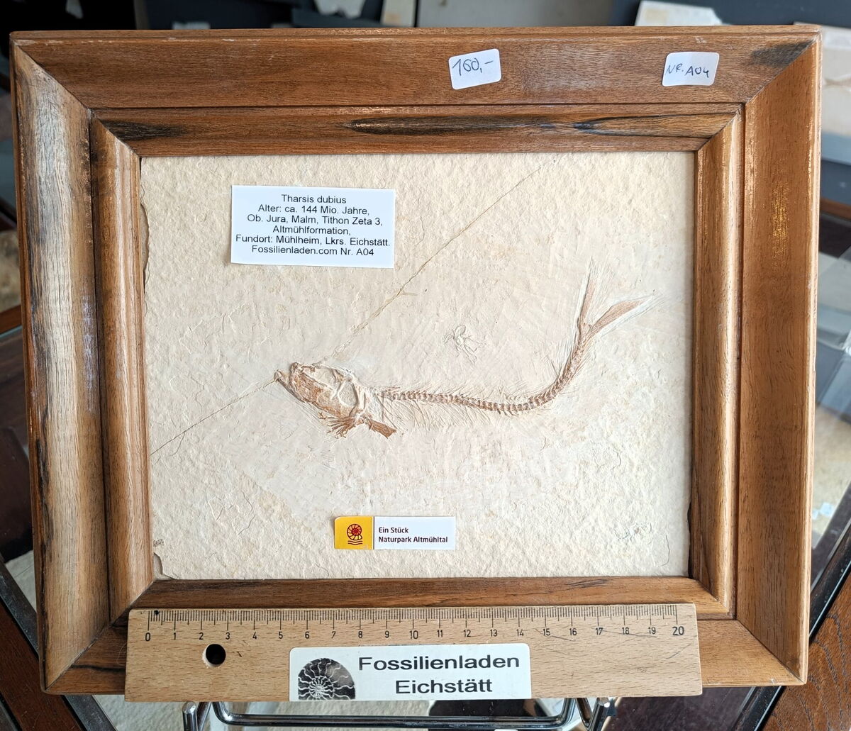 Ordnung: Fische (Pisces) Familie: Echte Knochenfische (Teleostei) Fundort: Mühlheim. Lanskreis Eichstätt, Obb. Jahre, Holzrahmen ca. 30 x 55 cm, Durchmesser Fisch ca. 15 cm, Gewicht ca. 1,09 kg, Plattte ca. 22 x 17 cm