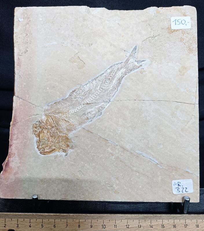 Alter: ca. 144 Mio. Jahre, Ob. Jura, Malm, Tithon Zeta 3, Altmühlformation, Fundort: Mühlheim, Lkrs. Eichstätt. Plattenstärke ca. 1,9 cm, Gewicht ca. 1590 g., Fisch ca. 13 cm