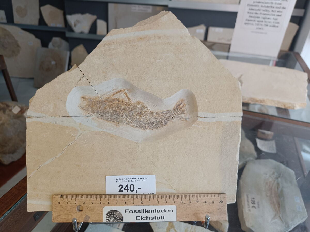 Fundort: Fundort: Blumenberg Eichstätt, Obb. Unter-Tithonium, Weißjura-Gruppe, Altmühltal-Formation, Obere Eichstätt-Subformation Malm Zeta 2b Biostratigraphie: Hybonotum-Zone Riedense-Subzone, eigeltingense-beta-Horizont Geschnittene Plattenunterkante ca. 26 cm, Stärke ca. 3 cm. Fossil max. ca. 14 cm.